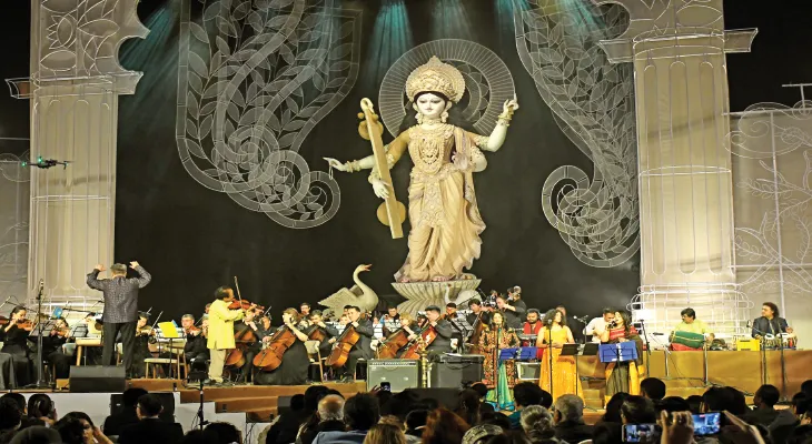 নিজস্ব প্রতিনিধি, কলকাতা: জীবনে প্রথমবার তাঁরা এসেছেন কলকাতায়। তাও আবার সরস্বতী পুজোয়। জাত-ধর্মের বেড়াজাল ভেঙে সরস্বতী বন্দনায় কাজাকিস্তানের নৃত্য দল ও অর্কেস্ট্রা। আয়োজনে টালা পার্ক প্রত্যয়। বুধবার টালা পার্ক প্রত্যয়ের সরস্বতী পুজোর আনুষ্ঠানিক উদ্বোধন হয়ে গেল। সেখানেই কাজাখস্তানের ব্যালে ট্রুপ এবং অর্কেস্ট্রার সঙ্গে যৌথভাবে অনুষ্ঠান পরিবেশন করেন সংগীতশিল্পী কবিতা কৃষ্ণমূর্তি এবং এল সুব্রহ্মণ্যম। তবলায় সংগত করেন পণ্ডিত তন্ময় বসু। সরস্বতী বন্দনায় আলো-আঁধারি মোহময়ী পরিবেশে মায়াবী হয়ে উঠেছিল গোটা এলাকা। বরাবর দুর্গাপুজোয় তাক লাগিয়েছে টালা পার্ক প্রত্যয়। পাঁচবছর ধরে সরস্বতী পুজোতেও চমক থাকে।