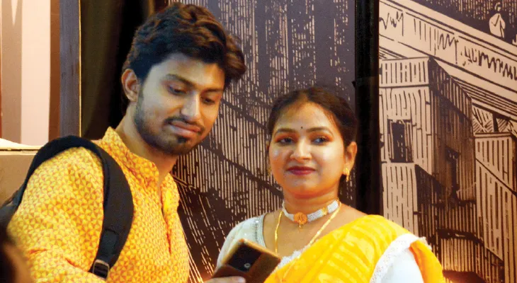 শীত যায় যায়। ফলে ফ্যাশনে সমস্যা হয়নি। শাড়ি, সালোয়ার, পাঞ্জাবি-পাজামায় সেজেছে সবাই। আর প্রায় সবারই অঙ্গে ঝলমল করেছে বাসন্তী হলুদ। ১১টা নাগাদ মেলাপ্রাঙ্গণে উপস্থিত একদল তরুণ-তরুণী। গেট তখনও খোলেনি। ফলে বাইরেই চলল সেলফি, চা, আড্ডা। গেট খুলতেই সোজা বইয়ের স্টলে। প্রত্যেকেরই বক্তব্য, ‘আজ যতক্ষণ না বের করে দেবে, ততক্ষণ থাকব ভিতরে। বাড়ি ফেরার কোনও তাড়া নেই আজ।’ এসব মিলিয়ে বইমেলা প্রাঙ্গণ যেন পুজোর দিনের কলেজ ক্যাম্পাস।