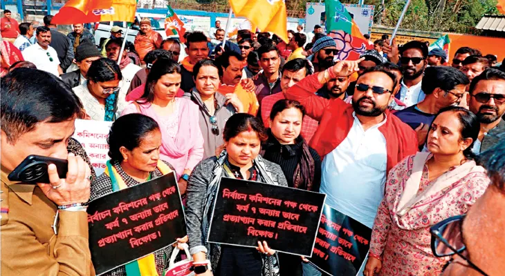 কমিশন সূত্রে জানা জানা গিয়েছে, জমা পড়া ফরম সেভেনগুলি যাচাই করা হবে। যাদের বিরুদ্ধে অভিযোগ রয়েছে, তাদের প্রত্যেককে শুনানিতে ডাকা হবে। তবে তৃণমূলের আশঙ্কা যাদের বিরুদ্ধে অভিযোগ রয়েছে, তাদের নোটিস করে না ডেকেই নাম বাদ দেওয়া হতে পারে। খাতায় কলমে কমিশন নোটিস দেওয়ার কথা জানাবে। কিন্তু, বাস্তবে তা নাও হতে পারে। আসানসোলে বিজেপির বিক্ষোভ।-নিজস্ব চিত্র