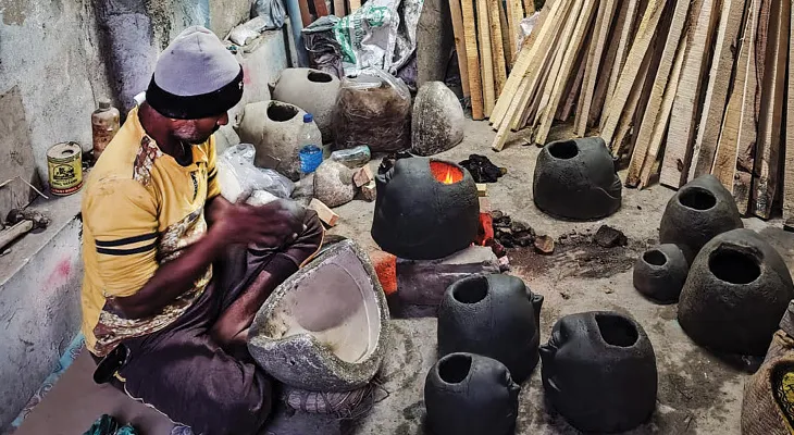 এখন দিনেদুপুরেও সোয়েটার-চাদর গায়ে চাপিয়ে কুমোরটুলির মৃৎশিল্পীরা সরস্বতী তৈরি করছেন। কাজ চলছে খুব ঢিমেতালে। মঙ্গলবার পটুয়াপাড়ার বিস্তীর্ণ এলাকায় আগুন জ্বেলে মূর্তি শুকোনোর কাজ চলছে। সরস্বতীর মুখ শোকানো হচ্ছে কাঠের আগুনে। গনগন করে জ্বলছে অঙ্গার, তার মধ্যে বসানো প্রতিমার মুখ। মৃৎশিল্পীদের বক্তব্য, ‘লাগাম ছাড়া ঠান্ডা। রোদ না ওঠায় শুকোনোর কাজে সমস্যা হচ্ছে। কিন্তু সময়ে ডেলিভারি করতে হবেই। তাই আগুনে শুকোনো চলছে। এরপর পরিস্থিতি এক থাকলে কেরোসিনের পাম্প স্টোভও ব্যবহার করতে হবে।’