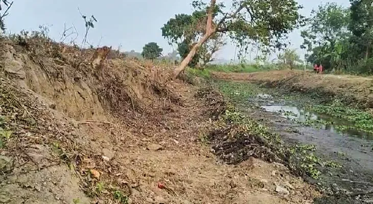 বিক্ষোভকারীদের স্পষ্ট হুঁশিয়ারি, খাল সংস্কারের নামে মাটি ও গাছ কাটা চলবে না।