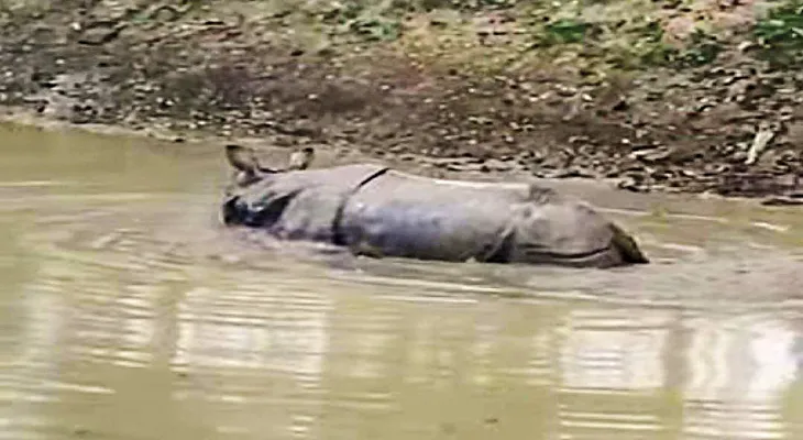সেই সময় আচমকা এলাকায় গন্ডার দেখে ছন্দপতন ঘটে যায় নতুনপাড়ার বাসিন্দাদের। আতঙ্কিত হয়ে পড়েন সকলে। খেতে গোরু নিয়ে যাচ্ছিলেন জইদুল মিয়াঁ। গন্ডারের গুঁতোয় জইদুলের একটি গোরু মারাত্মক জখম হয়। গন্ডারটি এলাকায় কয়েকজনের সবজি খেত তছনছ করে। ৯টা নাগাদ উত্তম রায়ের পুকুরে নেমে যায়। কৌতূহলী জনতা দূর থেকে গন্ডারের ছবি মোবাইলের ক্যামেরায় বন্দি করতে থাকেন।