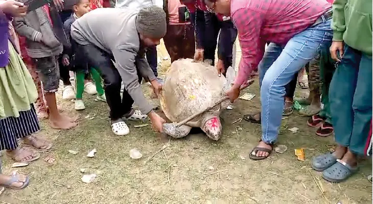 সংবাদদাতা, ঘাটাল: দাসপুর থানার কুল্টিকুরিতে এক মৎস্যজীবীর জালে বিশালাকার সামুদ্রিক কচ্ছপ ধরা পড়ে। সোমবার সকালে রূপনারায়ণ নদ থেকে উদ্ধার হওয়া ওই বিশালাকার কচ্ছপটিকে দেখার জন্য পশ্চিম মেদিনীপুর, পূর্ব মেদিনীপুর এবং হাওড়া এই তিন জেলা থেকে মানুষের ঢল নেমে আসে। গ্রামের বাসিন্দারা কচ্ছপটি উদ্ধারের পরই তাকে কূর্ম দেবতা হিসেবে পুজো করতে শুরু করেন। কচ্ছপ উদ্ধারের খবর পেয়ে বন দপ্তরের কর্মীরা ঘটনাস্থলে যান। ঘাটাল মহকুমা সোশাল ফরেস্ট্রির রেঞ্জার রতন সরকার বলেন, এদিন কুল্টিকুরিতে উদ্ধার হওয়া প্রাণীটি সামুদ্রিক কচ্ছপ বা সি টার্টেল। কচ্ছপটি অলিভ রিডলে প্রজাতির। বনদপ্তরের উপস্থিতিতেই কচ্ছপটিকে ফের রূপনারায়ণ নদেই ছেড়ে দেওয়া হয়েছে। কুল্টিকুরি গ্রামের বাসিন্দা মৎস্যজীবী রাজকুমার বারিক অন্যান্য দিনের মতোই রবিবার সন্ধ্যায় বাড়ির সামনের রূপনারায়ণ নদে মাছ ধরার জন্য জাল ফেলেছিলেন। রাজকুমারবাবু বলেন, এদিন সকালে জালটি গুটানোর সময় বিশাল টান লাগে। লোক জড়ো করে জালটি অনেক কষ্টে ডাঙায় তুলতে দেখা যায় প্রায় ৫০-৬০কেজি ওজনের ওই কচ্ছপটি জালের মধ্যে আটকে রয়েছে। কচ্ছপটি জাল থেকে বেরোনোর চেষ্টাও করেছিল। ফলে জালের বেশ কিছু জায়গা ছিঁড়েও গিয়েছে। এতো বড় কচ্ছপ রূপনারায়ণ নদে এর আগে কখনও দেখা যায়নি। তাই স্বভাবতই কচ্ছপটি উদ্ধারের খবর পেয়ে তিন জেলার বহু কৌতূহলী মানুষ কুল্টিকুরীতে যান। সেখানে অত্যুৎসাহী মানুষজন বিষ্ণুর দ্বিতীয় অবতার কূর্ম দেবতা হিসেবে সিঁদুর পরিয়ে পুজোরও ব্যবস্থা করেন। তারপরই বন দপ্তরের নির্দেশে তাকে ফের রূপনারায়ণে ছেড়ে দেওয়া হয়। বনদপ্তর সূত্রে জানা গিয়েছে, এদের মূলত প্রশান্ত মহাসাগর, ভারত মহাসাগর এবং আটলান্টিক মহাসাগরের উষ্ণ জলে বাস করতে দেখা যায়। এরা সমুদ্রের গভীরে বাস করলেও ডিম পাড়ার জন্য প্রতি বছর হাজার হাজার মাইল পাড়ি দিয়ে ওড়িশার ঋষিকুল্যা বা গহিরমাথা মতো সৈকতে দলবেঁধে যায়। এদের প্রধান বৈশিষ্ট, এরা খুব শান্ত প্রকৃতির প্রাণী। এরা মূলত সর্বভুক, অর্থাৎ মাছ, জেলিফিশ, কাঁকড়া এবং সামুদ্রিক শৈবাল খেয়ে বেঁচে থাকে। এদের শরীরের খোলসটি বেশ শক্ত হয় যা এদের শিকারি প্রাণীদের হাত থেকে রক্ষা করে। সামুদ্রিক কচ্ছপ ডাঙায় খুব অসহায় এবং বেশিক্ষণ জল ছাড়া থাকলে বা রোদে থাকলে এদের জীবন সংশয় হতে পারে।