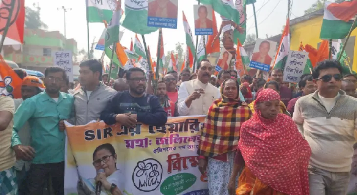 সংবাদদাতা, চাঁচল: এসআইআরের শুনানিকে ঘিরে হয়রানি ও আতঙ্কের অভিযোগে তপ্ত মালদহ। আতঙ্কে এক ভোটারের মৃত্যুর অভিযোগ করে বিজেপি ও নির্বাচন কমিশনের বিরুদ্ধে ধিক্কার মিছিল করল তৃণমূল কংগ্রেস। বুধবার চাঁচল ২ ব্লক তৃণমূলের উদ্যোগে মালতীপুর লাইব্রেরি মাঠ থেকে মিছিল শুরু হয়। উপস্থিত ছিলেন মৃত মহম্মদ জলিল শেখের স্ত্রী বলরামপুরের বাসিন্দা অমিসা বিবি। মিছিলে নেতৃত্ব দেন মালতীপুরের বিধায়ক আব্দুর রহিম বক্সি। মিছিল শেষ হয় ব্লক দপ্তরের সামনে শুনানি কেন্দ্রের কাছে। সেখানে ধিক্কার সভায় মৃত জলিলের কবর থেকে আনা মাটি কপালে মেখে বিজেপির বিরুদ্ধে আন্দোলনের শপথ নেন বিধায়ক সহ তৃণমূলের শতাধিক নেতাকর্মী। রহিম তাঁর মাসিক সাম্মানিক থেকে মৃতের পরিবারের হাতে ৫০ হাজার টাকার চেক তুলে দেন। পরে সভার মঞ্চে একের পর এক আক্রমণ করেন বিজেপিকে লক্ষ্য করে। অভিযোগ, পরিকল্পিতভাবে নির্বাচন কমিশনকে ব্যবহার করে সাধারণ মানুষকে হয়রান করছে কেন্দ্রের বিজেপি সরকার।