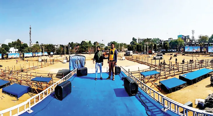 মেদিনীপুর সাংগঠনিক জেলা তৃণমূল সভাপতি সুজয় হাজরা ও মেদিনীপুর সাংগঠনিক যুব তৃণমূল সভাপতি নির্মাল্য চক্রবর্তীর কথায়, জনসভার জন্য আমরা সবদিক থেকে প্রস্তুত। আজ, প্রায় ১ লাখ মানুষের সমাগম হবে। প্রচুর সংখ্যক ভলান্টিয়ার নিয়োগ করা হচ্ছে। আমাদের একজন কর্মীও যাতে সমস্যায় না পড়েন, সেদিকে নজর দেওয়া হচ্ছে। প্রসঙ্গত, বিধানসভা নির্বাচন আসন্ন। একদিকে প্রশাসনিক স্তরে প্রস্তুতি শুরু হয়েছে, অপরদিকে জেলা জুড়ে রাজনৈতিক দলগুলির নানা কর্মসূচি দেখা যাচ্ছে। তৃণমূল চাইছে জেলা জুড়ে জয়ের ধারা বজায় রাখতে। তাই নির্বাচন আসতেই ফের কোমর বেঁধে নেমে পড়েছেন তৃণমূলের প্রথম সারির সব নেতারা। এদিকে, অভিষেক বন্দ্যোপাধ্যায়ের সভা নিয়ে কটাক্ষ করতে ছাড়ছে না গেরুয়া বাহিনী। মেদিনীপুর সাংগঠনিক জেলা বিজেপির সহ-সভাপতি শঙ্কর গুছাইত বলেন, ভাইপোকে সাধারণ মানুষ পছন্দ করেন না। ভাইপো মানেই দুর্নীতি। এবার দেখুন, বিজেপি ক্ষমতায় আসছে। এদিকে, ঘাটাল সাংগঠনিক জেলা তৃণমূল সভাপতি অজিত মাইতি বলেন, সামনের নির্বাচনের পর বিজেপি দলটাই আর থাকবে না। আজ মানুষের ঢল নামবে। যা দেখে স্থানীয় বিজেপি নেতারা ভয় পাবেন। অভিষেকের সভার প্রস্তুতি।-নিজস্ব চিত্র